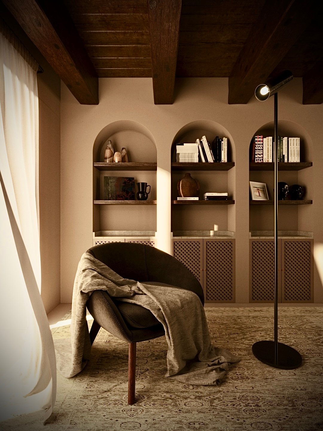The featured image of the living room-library shown here offers a detailed glimpse of one of the most special spaces in the house. The arches, which define the character of the space, create a warm and welcoming atmosphere, perfect for reading, relaxation, or enjoying peaceful moments. The 3D visualization allows you to appreciate the architectural details and the atmosphere that the house exudes with great precision.