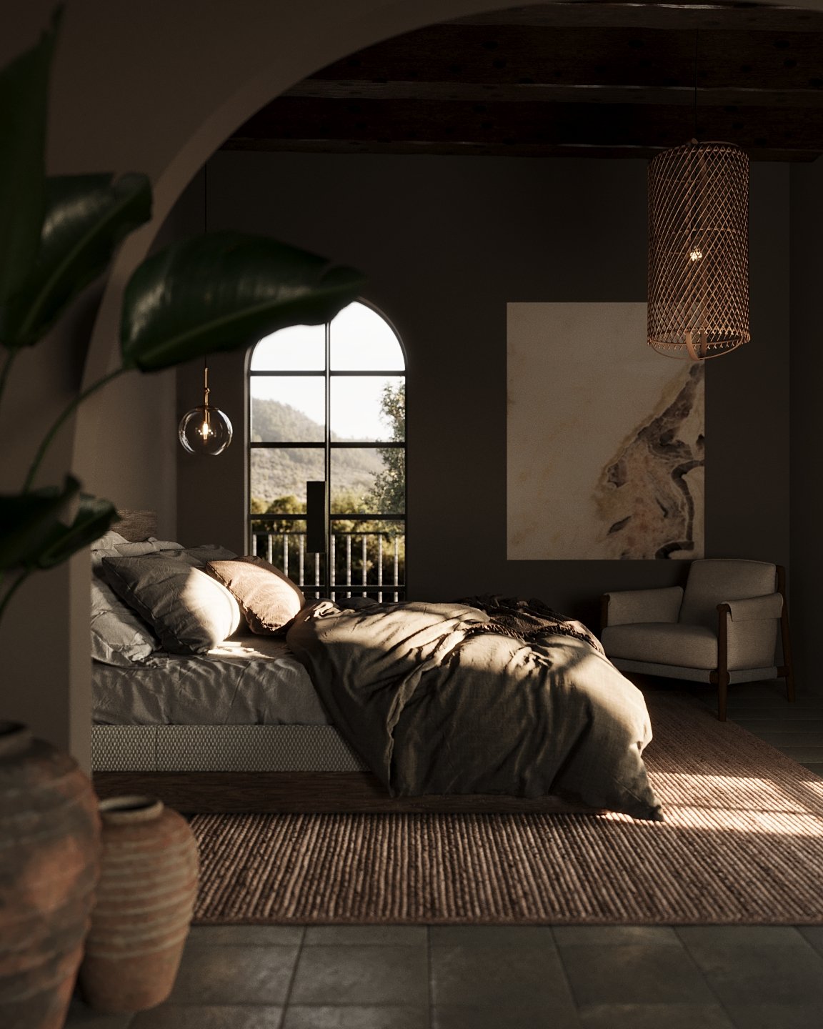 In the featured image of the bedroom, you can see how the dark tones of the room create an intimate and sophisticated atmosphere, highlighting the beauty of natural materials and the rustic design. Through the 3D visualization, we have captured how the soft light interacts with the textures, emphasizing the warmth and tranquility that this room can offer. While dark tones may seem like a bold choice, they actually contribute to creating a deep and immersive environment, perfect for rest and relaxation.
